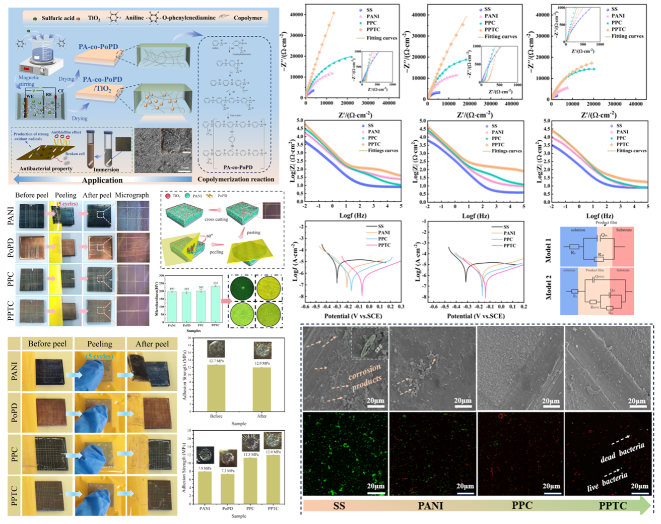PPTC复合薄膜展现出优异的机械性能,硬度达233 HV,附着力高达12.7 MPa。无论在干或湿环境下,经过多次胶带剥离测试,材料表面依然保持较完整,附着力未明显降低。在含SRB的3.5% NaCl溶液中,PPTC涂层表现出突出的防护性能,防护效率超过93%,浸泡7天后表面活菌覆盖率仅为0.1%。其防腐与抗菌双重功能主要归因于TiO2的杀菌作用及表面负电荷对细菌的排斥、涂层致密结构对腐蚀介质的有效阻隔,以及与基体的牢固结合。该工作以“Eco-friendly, robust electropolymerized nanocomposite coating for stainless steel against sulfate-reducing bacteria corrosion”为题发表在高分子科学类SCI期刊《Polymer》(影响因子4.5)。2023级硕士生黑鲜玲为第一作者,重庆三峡学院胡传波副教授、李廷真教授及香港浸会大学任康宁教授为论文共同指导教师。